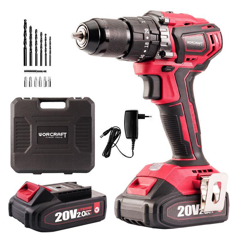 Шуруповерт WORCRAFT CHD-S20LiBAC постачається в комплекті з вдосконаленими двома акумуляторами CLB-20V-2.0H, штекерним зарядним пристроєм і міцним пластиковим кейсом.